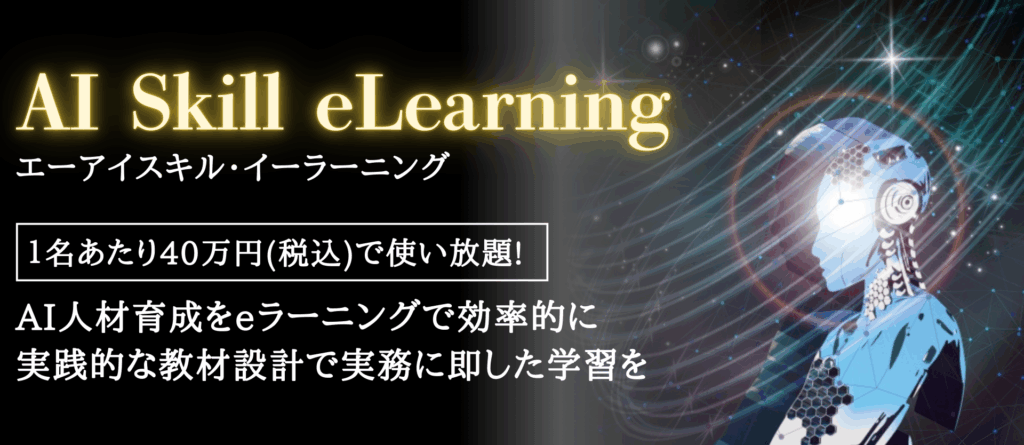 AI Skill eLearning(エーアイスキル・イーラーニング)は、業種・業務形態を問わず活用できる実践型のオンライン研修です。